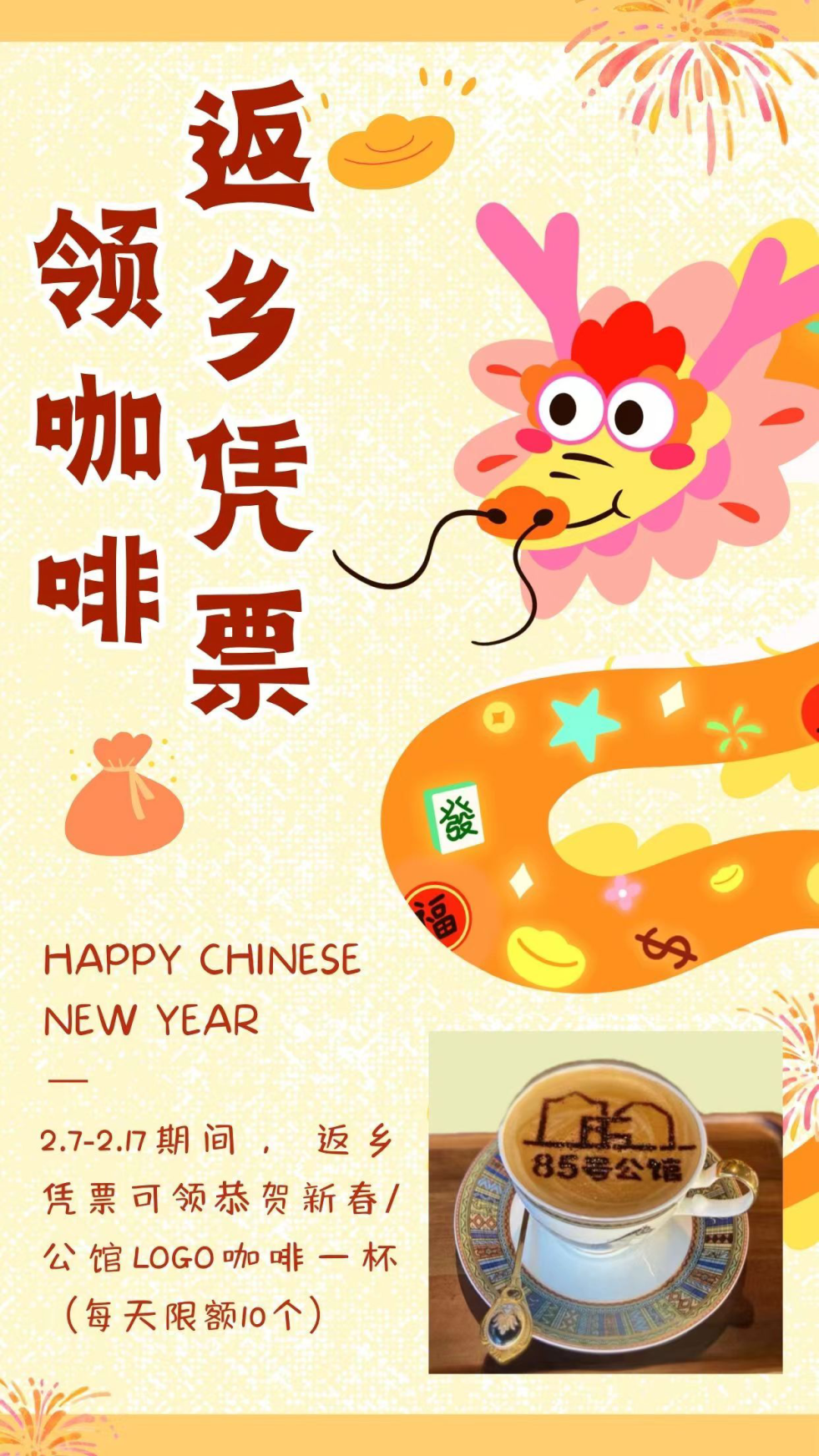 龙年新春佳节之际,85号创意公馆为返乡顾客精心准备了一份礼物,外地返乡顾客持返乡交通凭证及身份证可免费领取咖啡一杯,让归乡游子尝一尝家乡的味道。